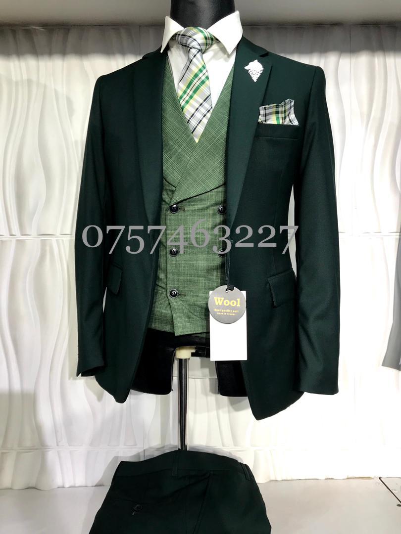 green coat , trouser, stripped tie and white shirt